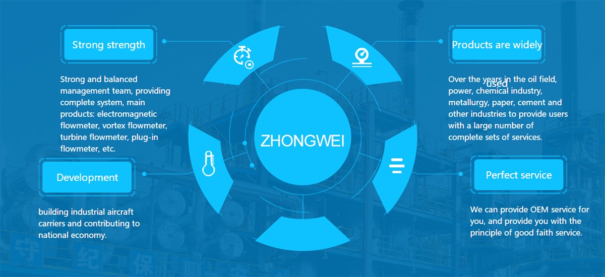Jiangsu Zhongwei Measurement and Control Co., Ltd. is located in Huaian City, the hometown of Premier Zhou, a great man of one generation. It has beautiful scenery, pleasant climate and abundant products. Main Products: Intelligent Vortex Flowmeter, Inserted Electromagnetic Flowmeter, Liquid Turbine Flowmeter, Elliptical Gear Flowmeter, Double Rotor Flowmeter, Waist Wheel Flowmeter and other flowmeters series, Liquid Level Meter Series...... [detailed]