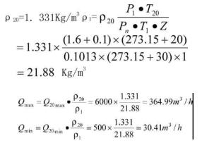 相對(duì)應(yīng)Qmin)1=×a,×3600=2.8×0.00205×3600=20.664m3/h對(duì)于80A(口徑為80的渦街流量計(jì)):