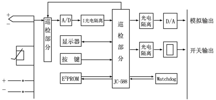 ZW-XMDA系列智能巡回顯示調節儀是由巡回測量回路,數字面板表、調節器和電源部分組成。穩壓電源將220V市電轉換成穩定的直流電壓作為其它部分電源。巡回測量回路則是將被測回路中的一路選定后送給A/D轉換后輸送到JC-588專用中央處理器進行處理后,不僅要送到數字面板表,而且也要送到調節器,與設定值比較后按調節規律輸出控制或報警信號。