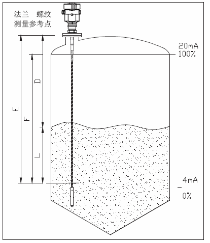 F-測量范圍;E-空罐距離;B-頂部盲區;H-探頭到罐壁的zui小距離 頂部盲區是指物料zui高料面與測量參考點之間的zui小距離。 底部盲區是指纜繩zui底部附近無法準確測量的一段距離。 頂部盲區和底部盲區之間是有效測量距離;