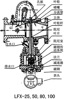 當(dāng)蒸汽進入本體后,因孔板或噴嘴的節(jié)流作用,其中一部分蒸汽經(jīng)分流進入本體的斜孔分流管道,噴射旋翼葉輪,形成一個轉(zhuǎn)矩,葉輪軸下部裝有阻尼葉片,阻尼葉片在注滿水的散熱器體內(nèi)旋轉(zhuǎn),使葉輪的旋轉(zhuǎn)受到阻尼作用,這樣葉輪就能有效地吸收射流的動能,使葉輪軸在葉輪的轉(zhuǎn)矩和阻尼片的制動轉(zhuǎn)矩相平衡的轉(zhuǎn)速下旋轉(zhuǎn)。進入本體的蒸汽是按一定比例分流到分流管道中的,而葉輪的轉(zhuǎn)速與分流量大小成正比關(guān)系,所以葉輪的轉(zhuǎn)速與通過的全部蒸汽流量也是成正比關(guān)系,葉輪軸的旋轉(zhuǎn)借助減速齒輪改變至合適的速度,再通過磁性聯(lián)軸器傳至計數(shù)器的指針,在表盤上即可直接讀出蒸汽的流量數(shù)值。配裝脈沖發(fā)生器,便可實現(xiàn)遠傳顯示。具體如圖: